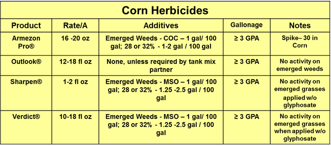 Applicators should understand the range of herbicide rates listed in the tables below are typically dependent on soil type. If you have questions consult the label or contact local BASF rep for further information. Applicators should ensure you are using the right type of nitrogen source when needed. While 28 or 32% Nitrogen is recommended for aerial application, liquid AMS or well mixed dry AMS products used at the equivalent rate of 8.5-17 lbs / 100 gal may be used in place of 28 or 32% nitrogen. Non-slurried dry AMS as well as water conditioning products are NOT recommended. Finally, consider using overlapping residuals, instead applying all highest rate of one residual herbicide aerially, instead apply the first residual by aerial application and then return with a second residual herbicide at the early post-emergence application time. An example might be using 10 oz of Verdict applied by air and then following with 16 oz of Armezon PRO applied to corn post emergence.